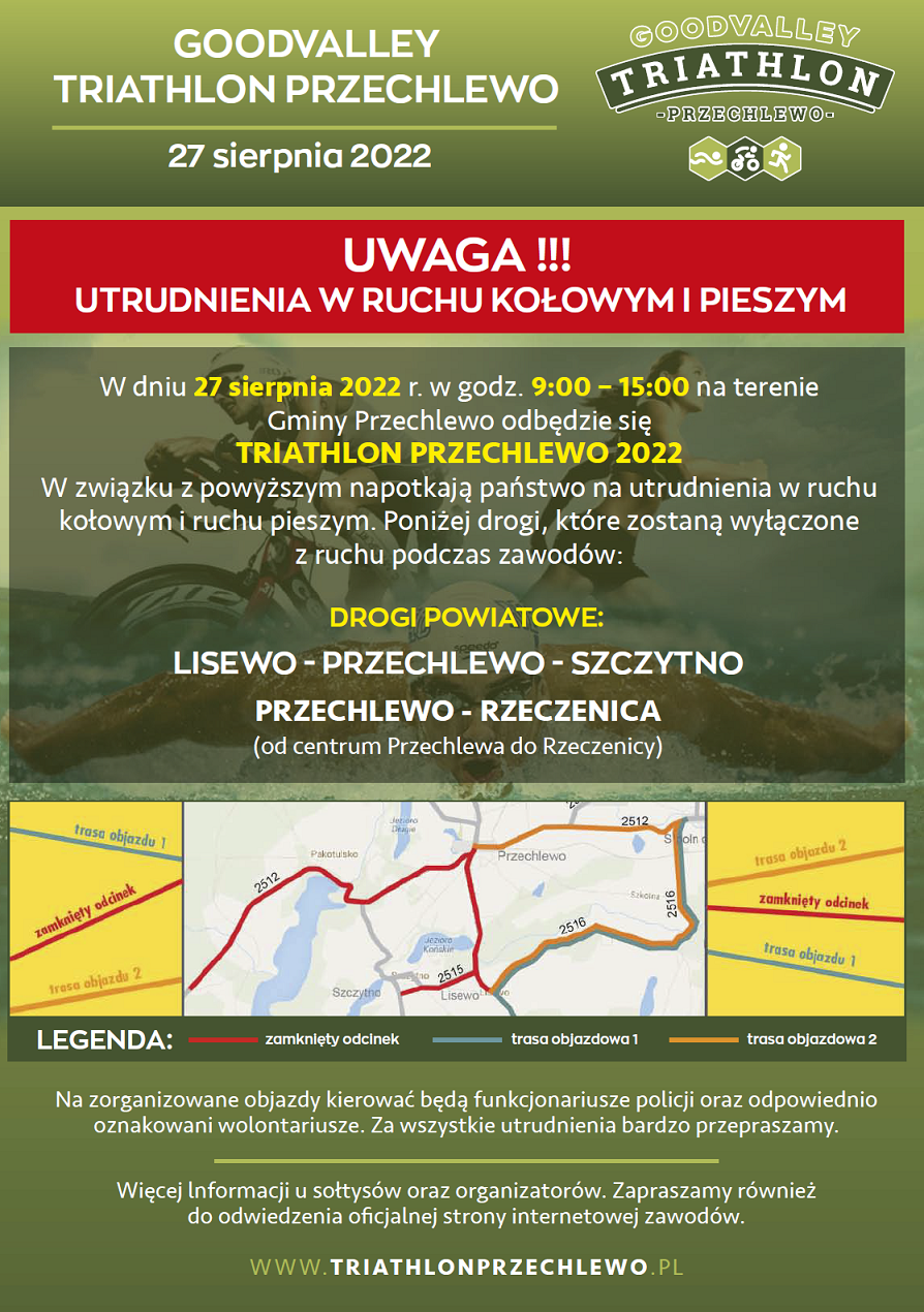 Utrudnienia w ruchu kołowym i pieszym Triathlon Przechlewo w dniu 27.08.2022